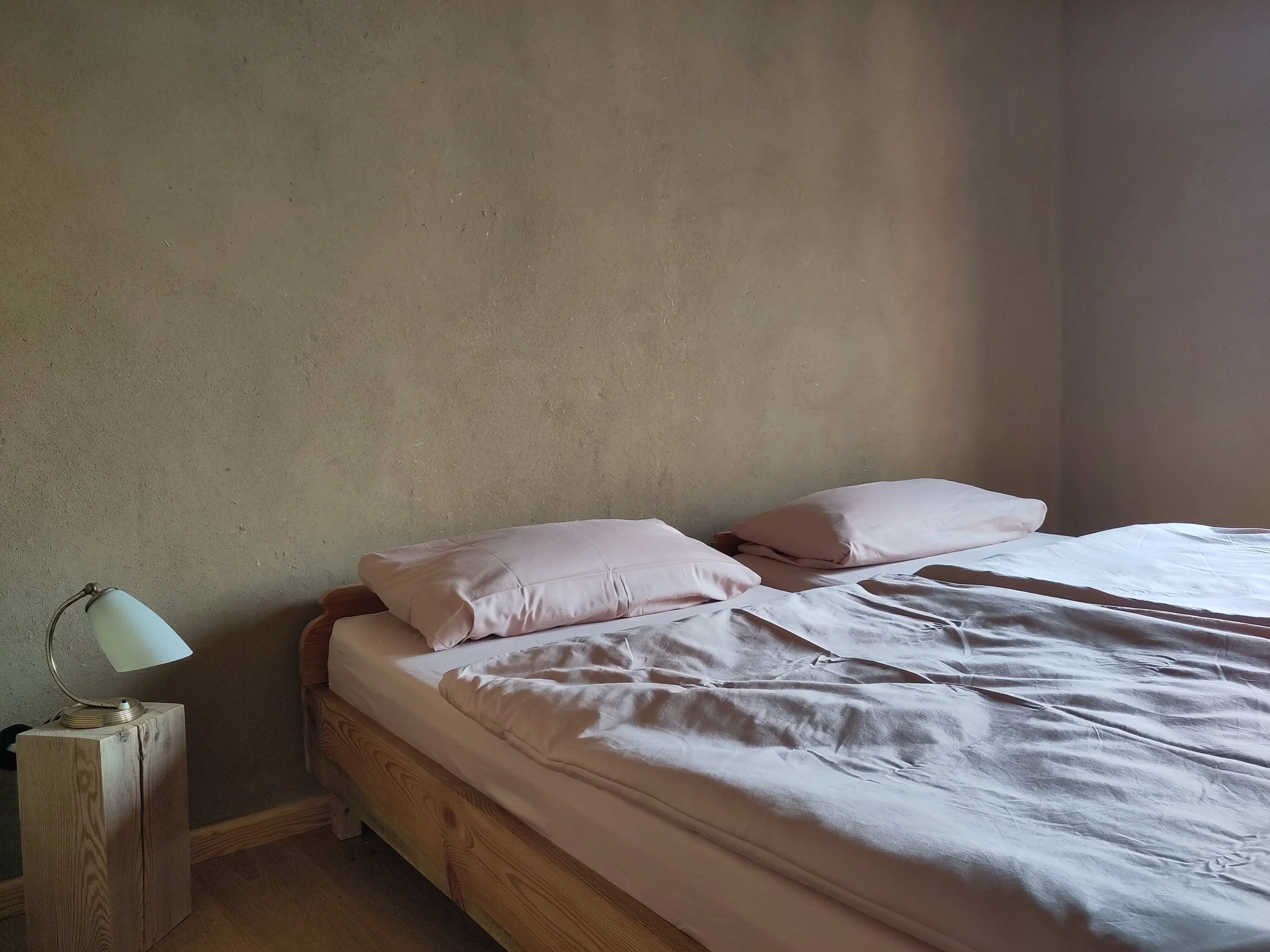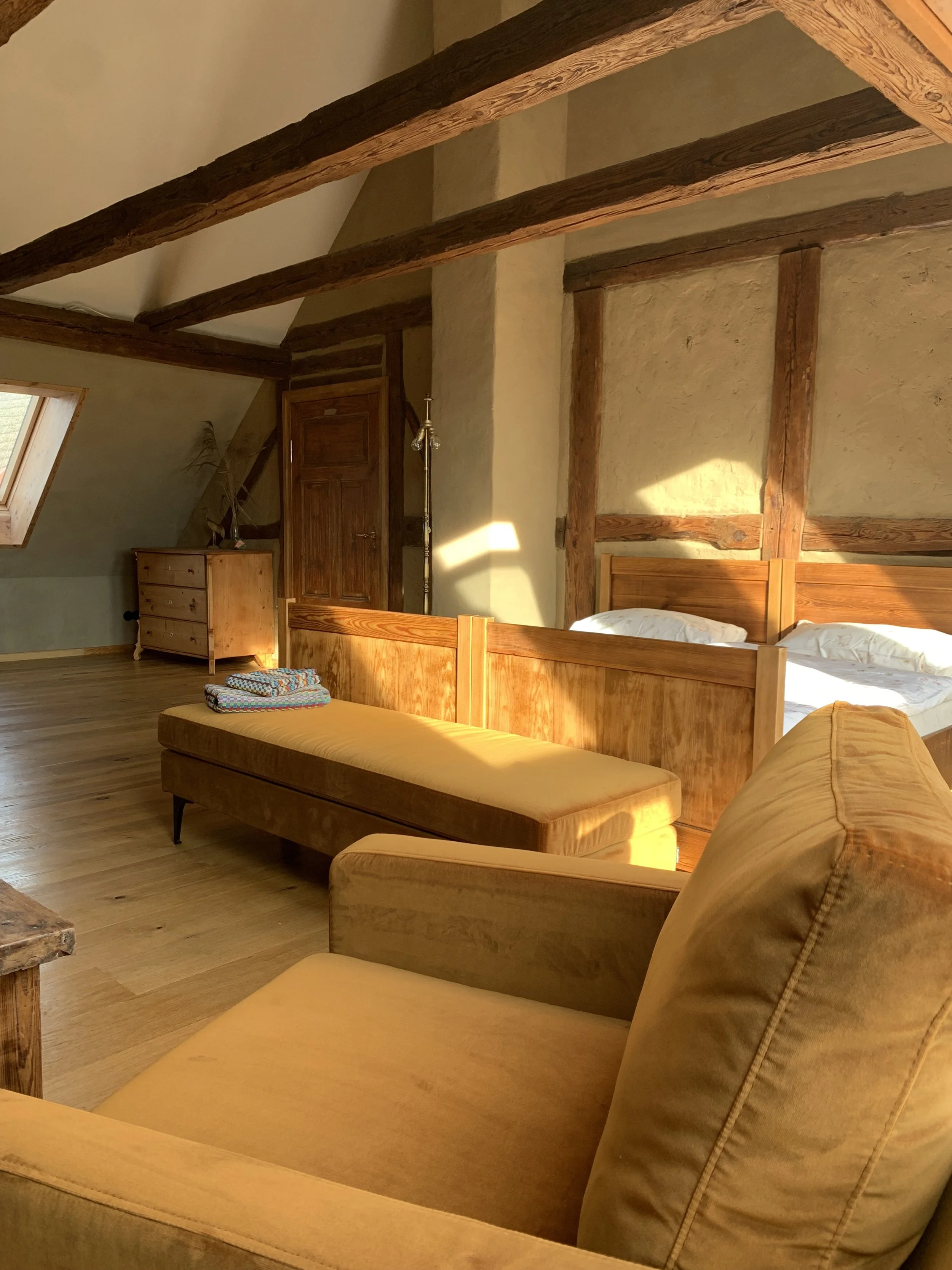 ist ca. 20qm groß. Das Zimmer hat zwei bodentiefe Fenster, mit Blick auf den Innenhof, die Sommerlinde und zwischen ehemaligem Stall und Scheune, über die Felder hinaus. Der beste Ort für einen Sonnenuntergang. Es ist wirklich gemütlich mit Sofa und im Sommer ist es das kühlste Zimmer. Das Bad hat eine ebenerdige Dusche.